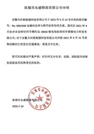 2024年12月30日,当地公安机关给我出具了受案回执;迫于压力,2025年7月14日,宣城市永盛物流有限公司给我开了申明文件,证实所有的运输凭证和票据均系天时公司伪造,永盛物流未安排任何车辆给天时公司运输我司货物,所以更不存在发生交通事故,交通事故纯属捏造和伪造。