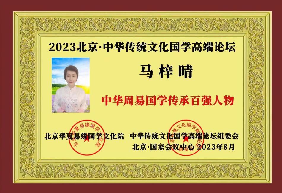 汇聚国学正能量,携手助力中国梦,马梓晴在2023年8月北京国家会议中心,任中华传统文化国学高端论坛大会副秘书长,同时担任大会执行主席,并获得中华周易国学传承百强人物。