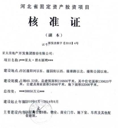 2010年1月22日,亚太公司在该片区规划建设项目正式通过河北省发展和改革委员会核准。项目核准证注明:项目名称为《亚太•碧水丽湾》,建筑规模60.23亩,总投资38850万元,规划总建筑面积216666平方米,其中住宅面积130620平方米,建设期限为2010年1月至2014年6月,建设内容为26层商住宅8栋。