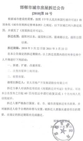 2009年9月,来自北京,注册资本1.2亿的亚太房地产开发集团股份有限公司(以下简称:亚太公司)通过邯郸市自然资源和规划局的招拍挂取得了该片区的开发使用权,同时享受邯郸市政府“(2009)39号”文件的优惠政策,负责拆迁补偿安置。
