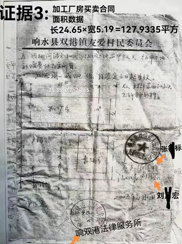证据三,张某标2005年1月13日购买友爱村加工厂房平方米数据。此房面积是127.9335平方米(长24.65×宽5.19),上面乙方是张某标,甲方是原村主任刘某宏,见证单位是双港镇法律服务所。把127.9335平方米房屋拆成80.03平方米数据,显然违背事实常理,放在谁的身上都不会同意。把原房长是24.65米,被拆成为15.1米,少掉了9.55米,谁能同意?把宽是5.19米被拆成为5.30米,多出了0.11米,谁能相信?