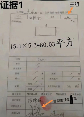 证据一,《双港镇友爱村(居)住房条件改善测量信息表》上是三组,被拆房农户叫张某标,村负责人是村副主任张某雯与镇另2人。友爱村三组根本没有张某标这个人,三组也没有80.03平方米(长15.1×宽5.3)房屋被拆除。反映人张某成与张某标是亲兄弟,张某标有几处房,张某成非常清楚。张某标是友爱村四组人,在全友爱村没有80.03平方米房子被拆,这是铁的事实。