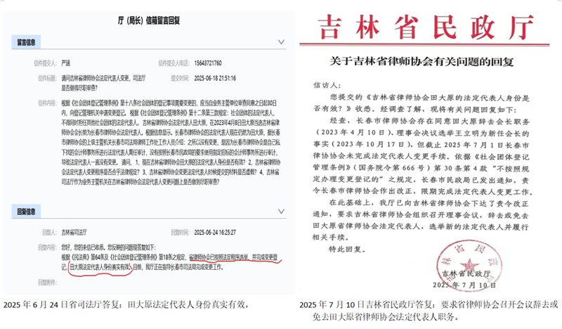 2025年6月24日司法厅答复:根据《中华人民共和国民法典》第六十四条及《社会团体登记管理条例》第十八条之规定,省律师协会已按照法定程序选举、并完成变更登记,田大原法定代表人身份真实有效。目前,我厅正在指导长春市司法局完成变更工作。