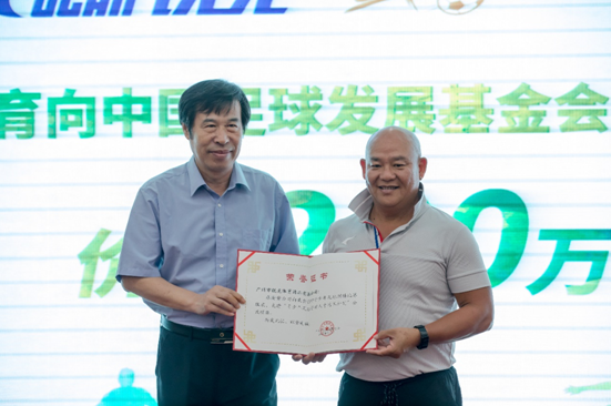 中国足球发展基金会理事长董鑫萍向锐克公司董事长赵达新颁发荣誉证书
