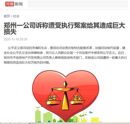 公平正义是司法的灵魂和生命,要深化司法责任制综合配套改革,加强司法制约监督,健全社会公平正义法治保障制度,努力让人民群众在每一个司法案件中感受到公平正义。近日,郑州市予宛房地产开发有限公司负责人姜某明致函有关部门,反映该公司因遭受一起重大执行冤案给其造成巨大经济损失的问题。