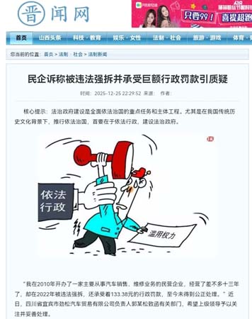 公平正义,国之基址。我的诉求,一是依法追究违法强拆的责任。法院判决已定,是否应依法对西郊街道办事处及相关责任人的违法行为进行问责,而不只是止于“确认违法”四字?二是撤销错误的行政处罚。宜宾市自然资源和规划局的罚款,对象错误、选择性执法、程序存凝。应撤销对我的处罚,并依法追究违法出租土地一方的责任;三是进行合理的国家赔偿。对我被违法强拆所造成的全部直接与间接损失进行评估和赔偿,这是我作为公民的法定权利;四是给出一个系统性的交代。请上级部门彻查:这片土地的权属管理为何如此混乱?“选择性执法”的根源是什么?如何防止“拆后即租”的荒诞剧再次上演?维护国家法律权威和社会公平正义。 来源:晋闻网